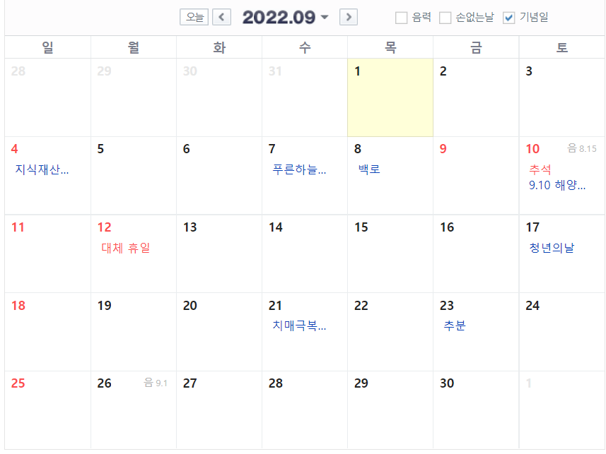가을 바람의 꽃말은 추석 연휴라고 하는데요. 즐거운 추석연휴는 얼마나 길까요? 아니, 근데 이게 무슨 일이야?? 추석연휴는 무려 이틀이나 주말에게 잡아 먹히고 말았습니다. 다행히 9월 12일이 대체 공휴일이라 9일부터 12일까지 조금 쉴 수 있긴 한데 휴일 이틀 뺏겼는데 하루만 돌려주는 건 섭섭하네요.