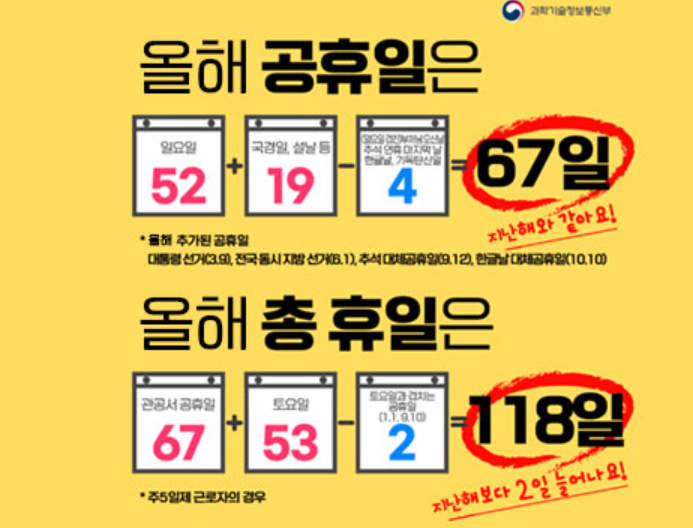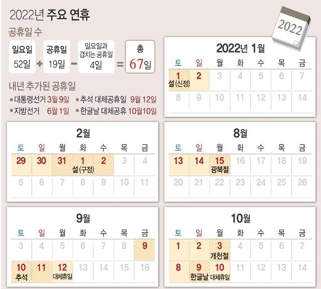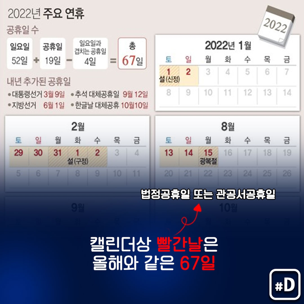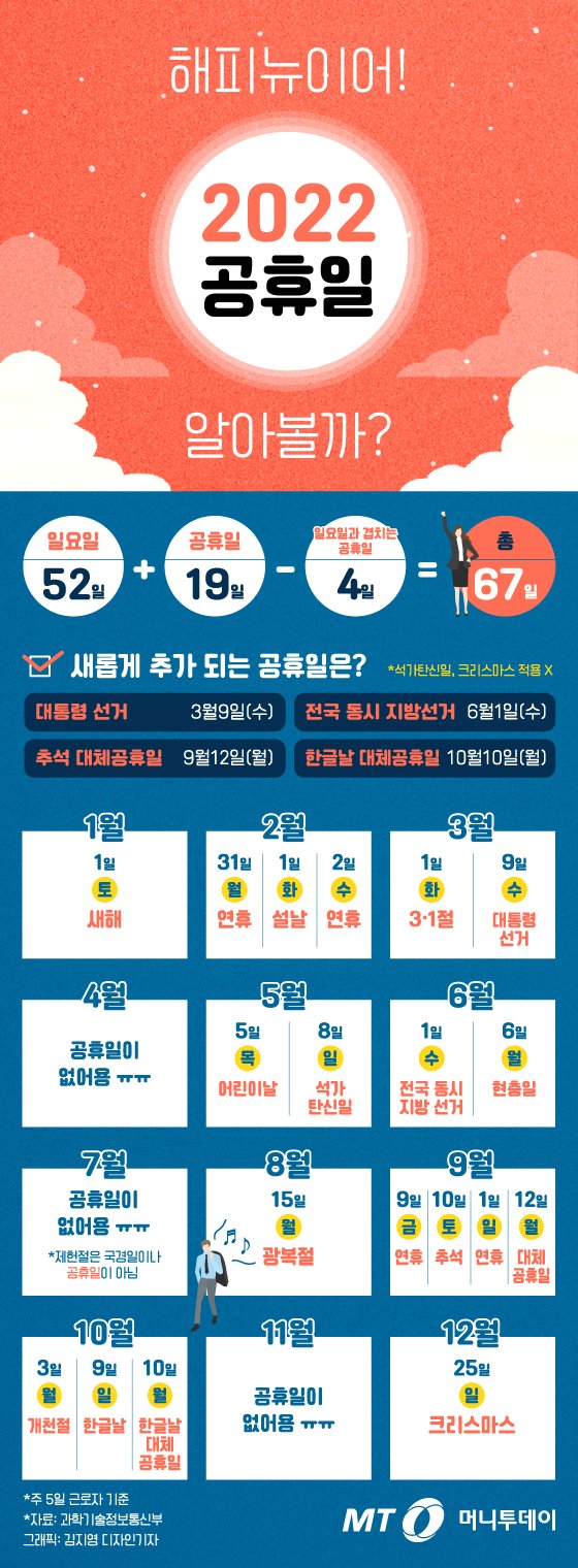 2022년 공휴일은 총 67일로 2021년과 같습니다. 하지만 토요일과 대체공휴일을 포함한 주 5일제 근무자 기준 휴일은 총 118일로 2021년보다 2일 늘어났습니다.