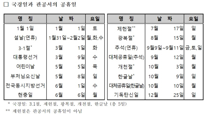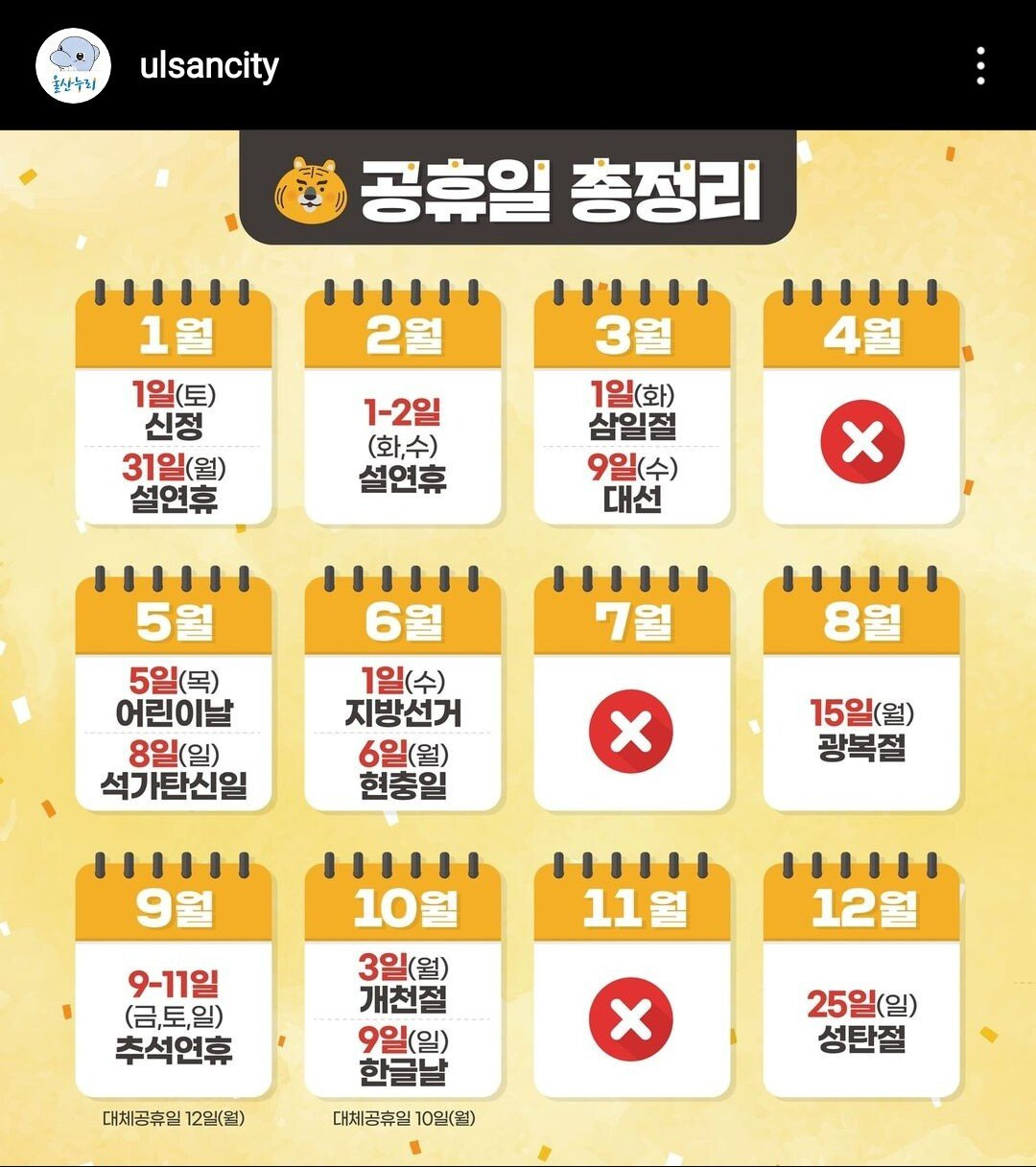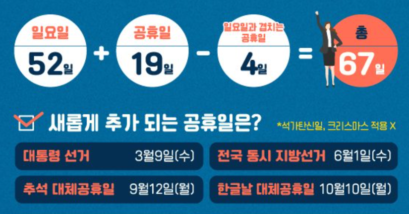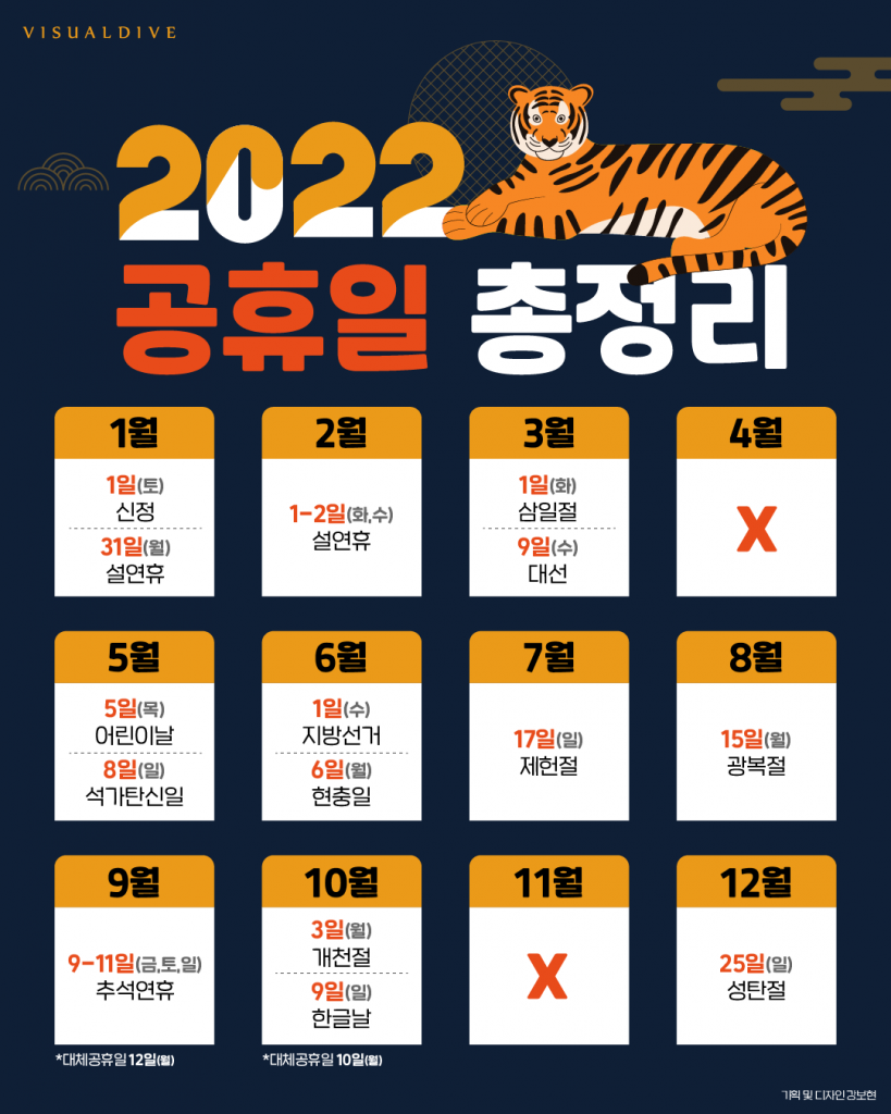 먼저 2022년에 추가되는 공휴일은 대통령 선거일인, 3월9일(수요일), 그리고 지방자치 선거일인 6월1일(수요일), 그리고 추석 대체공휴일인 9월12일(월), 마지막으로 한글날 대체공휴일인 10월10일(월요일)이 있습니다. 부처님 오신날과 크리스마스도 일요일이지만 국경일이 아니기 때문에 대체공휴일로 쉴 수는 없다고 합니다.