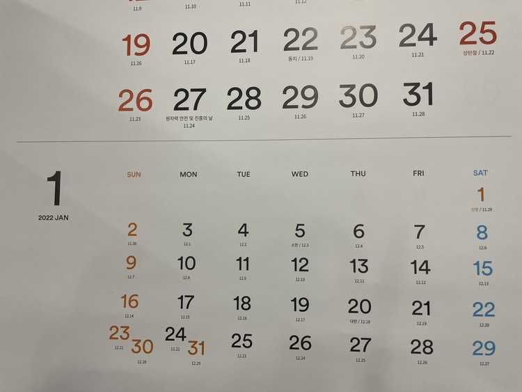 지난 두 달 휴일 없는 날들를 보내느라 참 힘들었는데 2022년 1월 1일도 토요일이라서 참 아쉬웠죠. 1월의 첫날은 아쉽게도 토요일이지만 설 연휴 첫째 날은 너무 다행히도 월요일입니다!!!