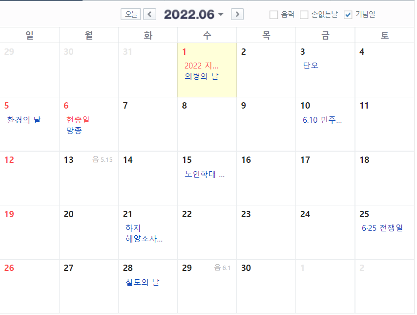 6월은 시작부터 상큼합니다. 첫째 날인 1일 수요일이 전국 동시 지방선거일이거든요. 또 6월 6일 현충일은 월요일이라 주말까지 합치면 3일을 내리 쉴 수 있답니다. 혹시나 휴가 쓰실 수 있는 분들은 6월 2, 3일에 휴가 내시고 길게 여행 떠나시는 것도 괜찮겠네요.