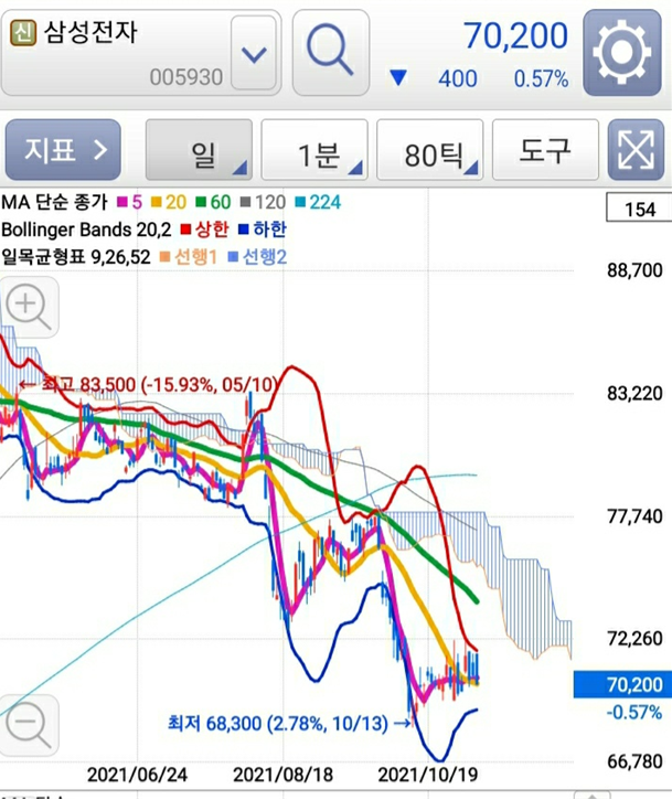 삼성전자가 급락한 이후로 여전히 아래에서 해메고 있는데요. 삼성전자는 국내 주식시장 시총 1위이자 대부분인 기업이자 지수에 영향을 줄 수 있는 종목이므로 주기적으로 차트를 분석해야 있으며, 자신이 가지고 있지 않아도 흐름이 어떤 식으로 흘러가는지 지켜보는게 중요합니다.