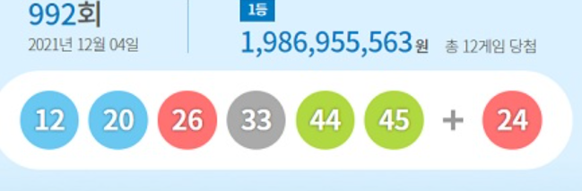 제 992회 로또 당첨 번호 검색결과는 '12, 20, 26, 33, 44, 45'입니다. 각 1 사람 당 19.8억원의 상금을 받았는데요. 992회 로또 당첨 번호 2등 보너스 번호는 '24'입니다.