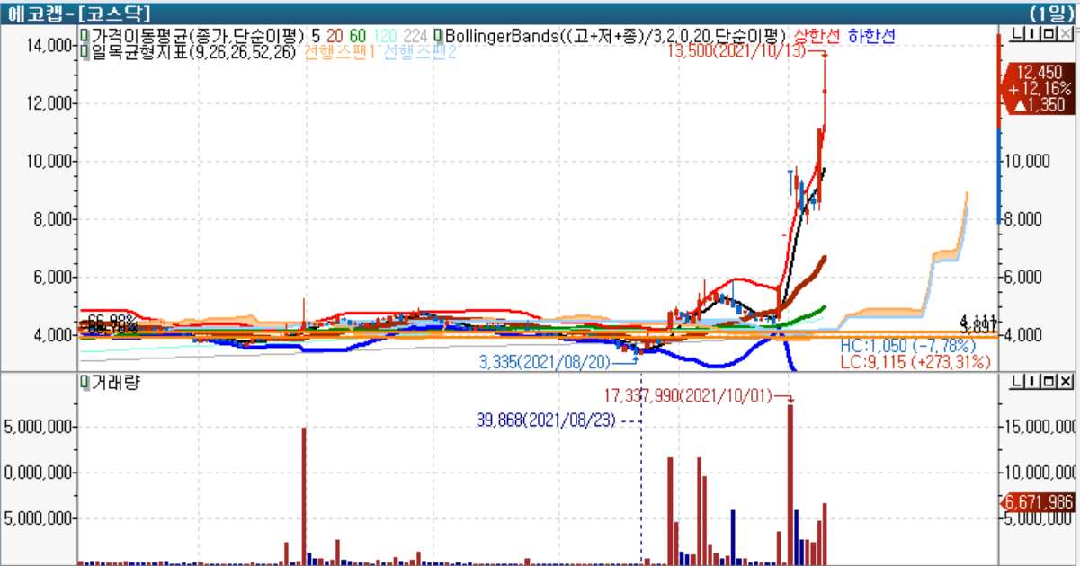 에코캡은 리비안 관련주 중 하나입니다. 10/12일 시장이 열린 초반부터 처음 상한가에 도달 한 주이며, 10/13일도 다시 그 가격을 초과해서 위아래로 강력하게 가격이 움직였습니다.