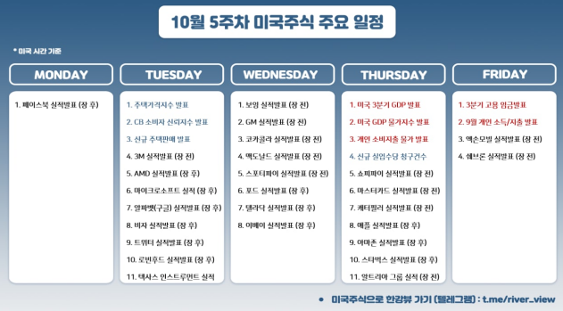 10월 마지막 주 주요 미국 주식의 일정은 다음과 같습니다.