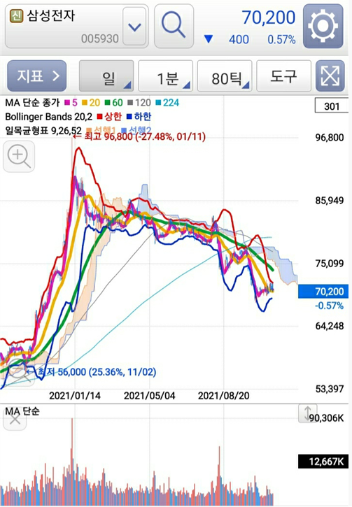 위와 같이 삼성전자 차트를 보면 아직은 5일선이 20일선 위로 살짝 올라온 상황이고 60일선 위로 갈 것 같은 움직임은 아직 보이고 있지 않은데요. 따라서 지금은 삼성전자 주가가 횡보할 가능성이 더 크지 않나 싶네요.