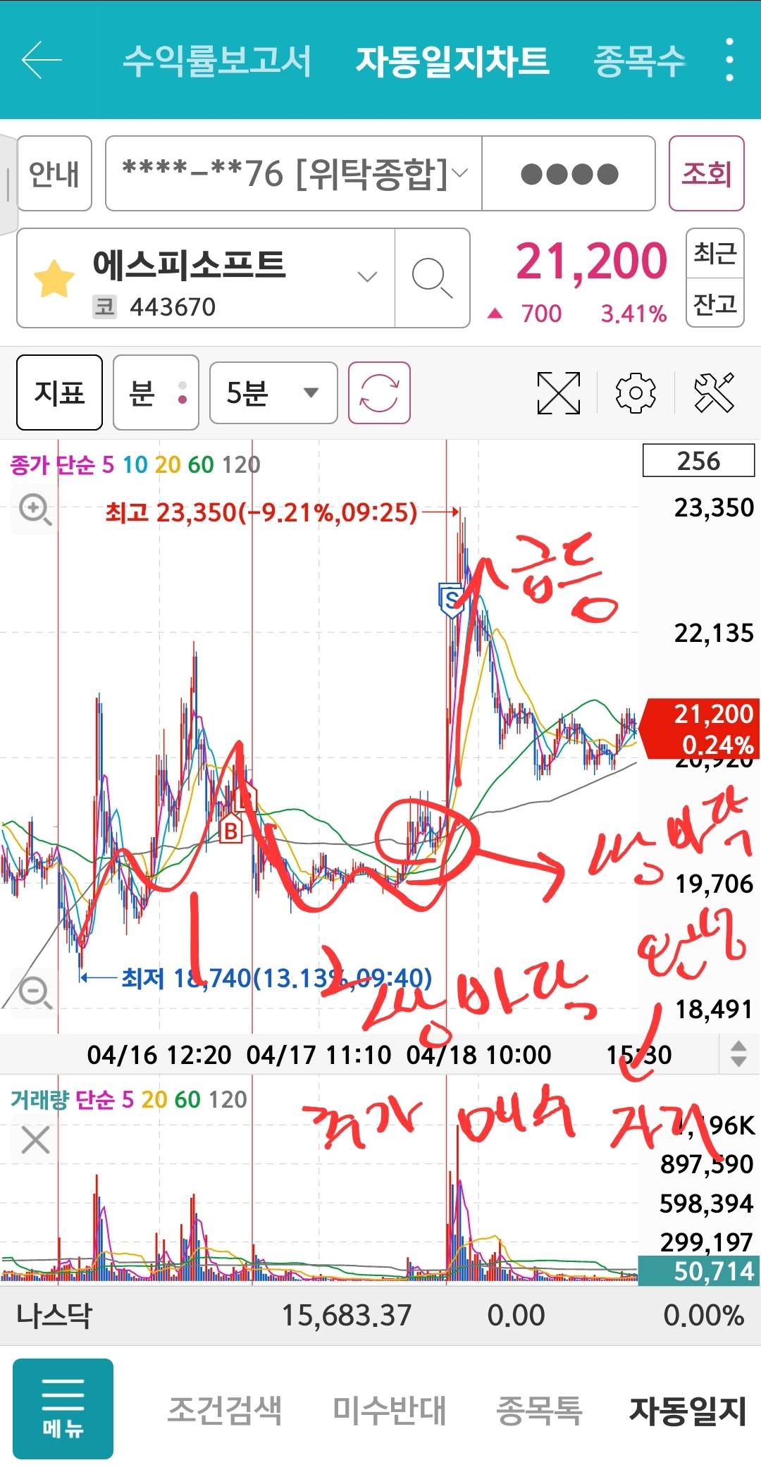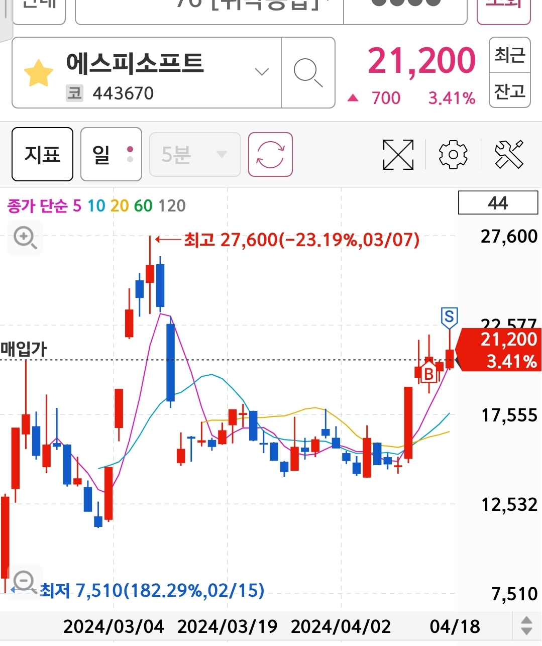 사고 나서 24.04.17 장 중에 추가 매수 타이밍을 노렸어야 했음. 아니, 샀어야...