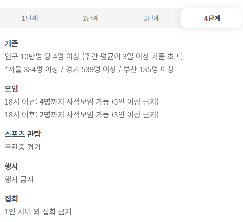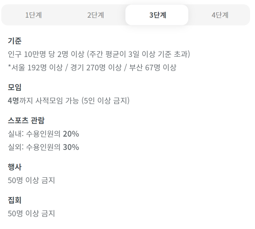 그리고 다음 사회적 거리두기 현황을 보면 전국적으로 코로나 단계 및 사회적 거리두기의 현황에 대해서 나오고 있습니다. 그러면서 각 코로나 단계 별로 어떻게 하면 된다라는 정보까지 나오니까 굉장히 보기도 편하고 알아보기도 편합니다.