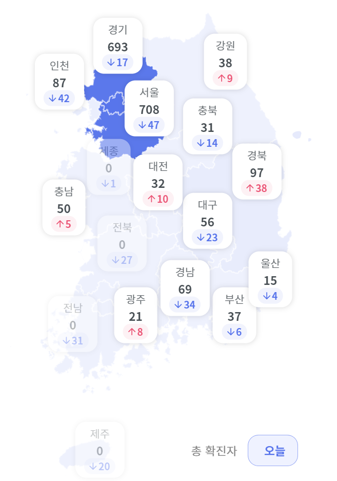 그리고 좀 밑으로 내려볼게요. 밑으로 내리면 지역별 표가 있는데요. 오늘 확진자가 서울 확진자가 몇 명, 사망자 몇 명, 완치자 몇 명이라는 것도 있고 다양한 정보를 각 지역별로 이렇게 쭉 나타내고 있고요.