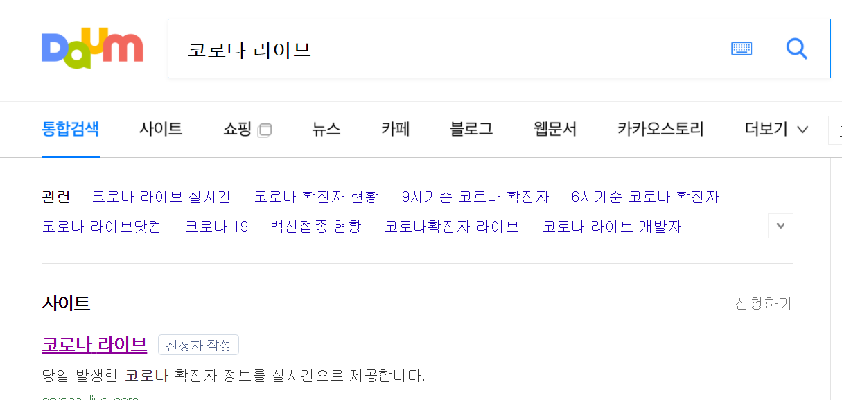 다음, 네이버, 구글과 같은 검색 사이트에서 '코로나 라이브'라고 검색하시면 코로나 라이브 홈페이지가 뜨기 때문에