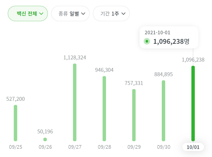 이번에는 백신 접종 현황을 알 수 있네요 1차 접종은 현재 우리나라 국민들의 약 77 퍼센트가 접종을 완료했고 2차 접종은 약 50%가 완료했다는 그런 백신 접종 현황 정보를 직관적으로 바로 알아볼 수 있게 해주고 또한 백신 전체로는 하루에 몇 명이 접종을 받았다라는 정보가 나옵니다. 10월 1일 기준으로는 약 109만 6,238명이 접종을 받았네요. 그리고 일별과 기간으로도 나옵니다. 정말 감탄 밖에 안나옵니다. 코로나 라이브는 국내 백신 접종 현황 마저도 알려 주는 건가요??