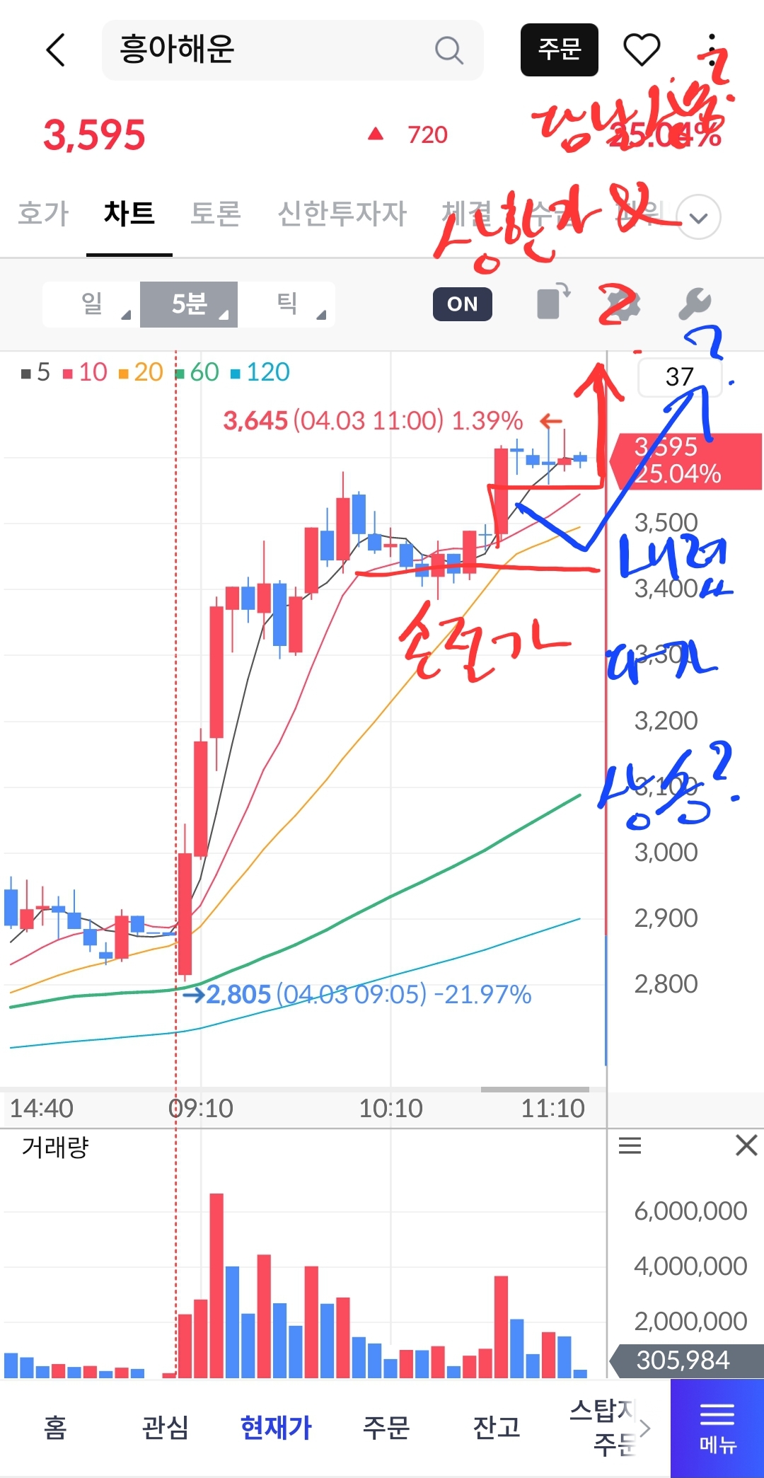오늘 중 상한가 따라잡기 겸 종가매수 : 흥아해운, 3500~3250 사이 분할 매수, 이대로 상하가 가거나 윗꼬리 거의 없는 장대양봉으로 마무리 하면 내일 장 초반에 상승하는 걸 노립니다. 손절가 3150