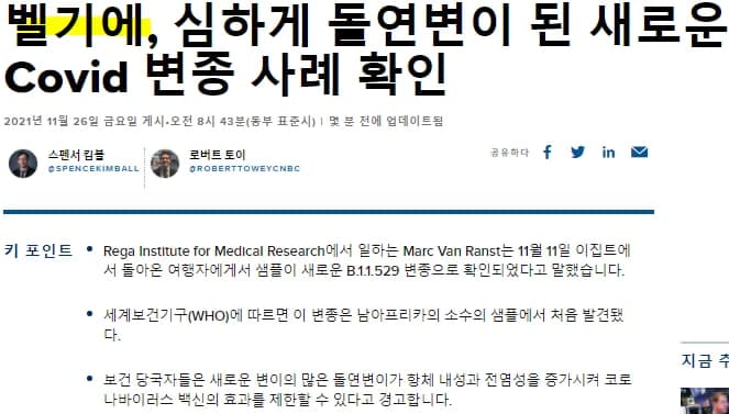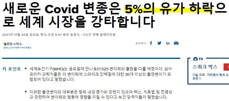 오늘의 미국 증시를 한 마디로 말하면 'Nu 변종 바이러스 쇼크'라고 말하고 싶은데요. 이 변이 바이러스가 남아프리카에서 시작되었고, 보츠니와, 남아공, 홍콩을 넘어서 이제 유럽까지 퍼지게 되었다고 합니다. 이대로라면 전세계로 퍼져나갈 것 같은데 미국에도 변이 바이러스가 상륙하게 된다면 다시 한 번 미국 증시가 급락할 가능성도 있다고 봅니다.