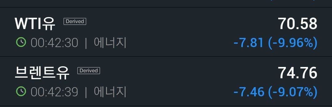 이번에는 유가를 알아봅시다. 코로나 Nu 변이 바이러스 공포로 인하여 유가마저 급락했습니다. 오랜만에 거의 대부분의 투자 상품들이 시원하게 빠지는 모습이 연출되네요. 코로나가 처음 터지고 난 이후 처음이 아닌가 싶습니다.