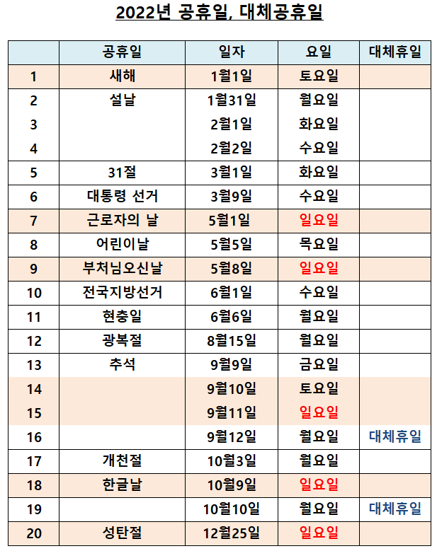 오늘은 2022년 공휴일에 대해서 알려 드리는 포스팅을 해보겠습니다. 2022년 공휴일은 전부 며칠일까요? 얼마나 쉴 수 있는지 궁금하시죠. 그럼 제가 정리해 드리겠습니다.