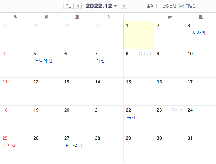 모두가 기다려 마지않는 크리스마스가 2022년에는 일요일이라니 벌써부터 슬퍼지는데요. 게다가 크리스마스 대체휴일은 없습니다. 크리스마스는 국경일이 아니기 때문에 대체휴일 지정 대상이 아니기 때문입니다. 그래도 어쩌겠어요. 대신 연말에 휴가 몰아서 쓰면 되겠죠.