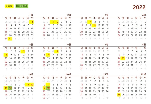 먼저 2022년에 추가되는 공휴일은 대통령 선거일인, 3월9일(수요일), 그리고 지방자치 선거일인 6월1일(수요일), 그리고 추석 대체공휴일인 9월12일(월), 마지막으로 한글날 대체공휴일인 10월10일(월요일)이 있습니다. 부처님 오신날과 크리스마스도 일요일이지만 국경일이 아니기 때문에 대체공휴일로 쉴 수는 없다고 합니다.