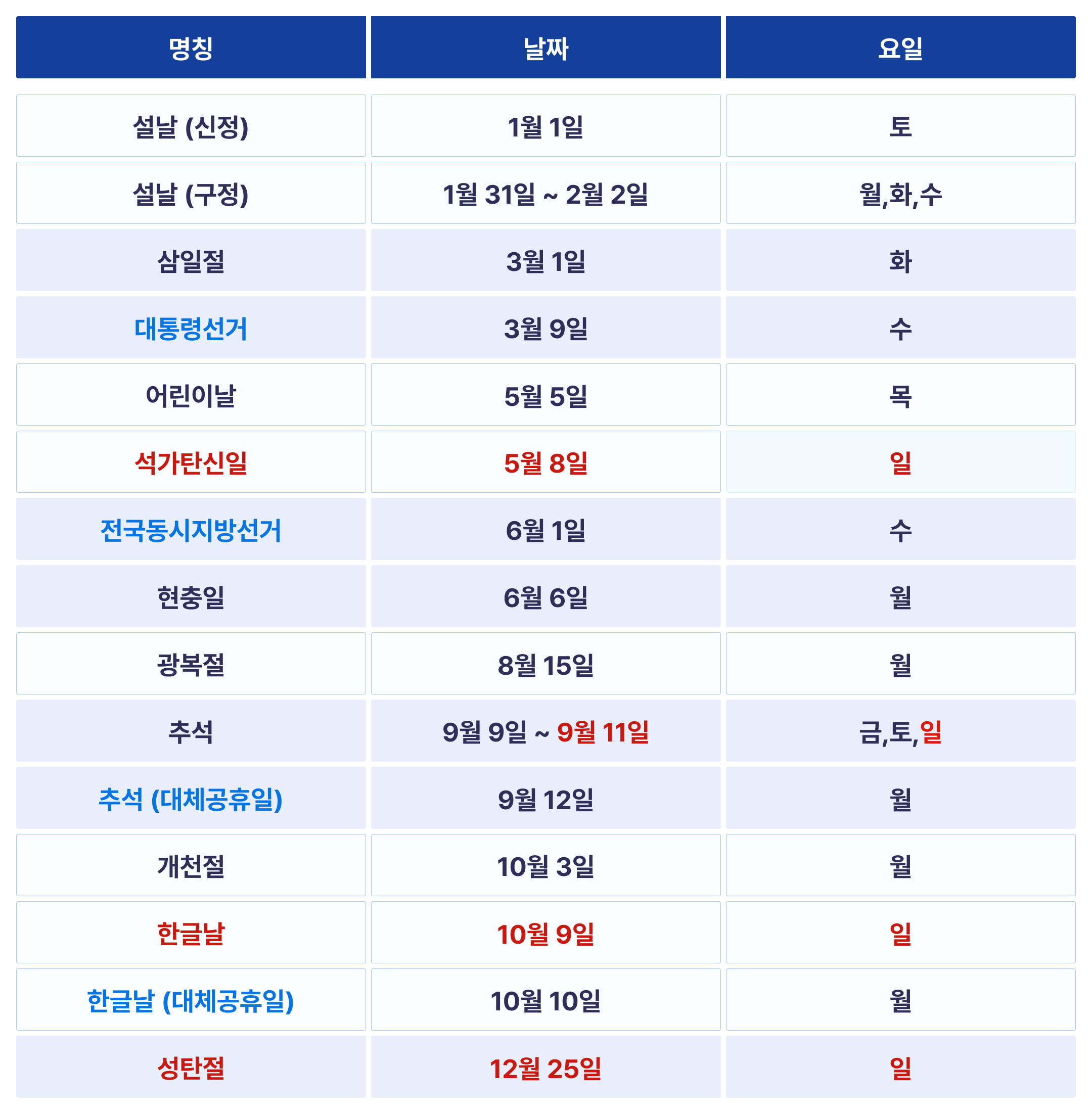 먼저 2022년에 추가되는 공휴일은 대통령 선거일인, 3월9일(수요일), 그리고 지방자치 선거일인 6월1일(수요일), 그리고 추석 대체공휴일인 9월12일(월), 마지막으로 한글날 대체공휴일인 10월10일(월요일)이 있습니다. 부처님 오신날과 크리스마스도 일요일이지만 국경일이 아니기 때문에 대체공휴일로 쉴 수는 없다고 합니다.