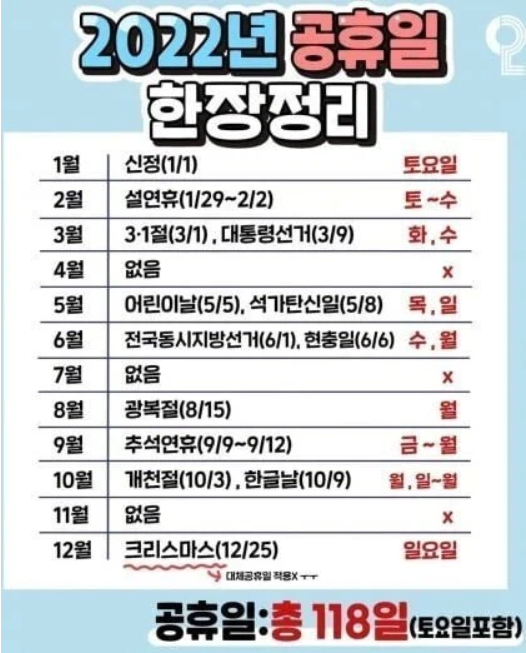 1년이 365일인데 주5일 근무자 기준으로 118일이 휴일이라면 2022년엔 3일에 한 번꼴로 쉴 수 있는 거죠. 그렇다면 당장 구체적인 2022년 공휴일 일정이 어떻게 되는지 알아볼까요? 그래야 휴가 계획도 세우는 거니까요.