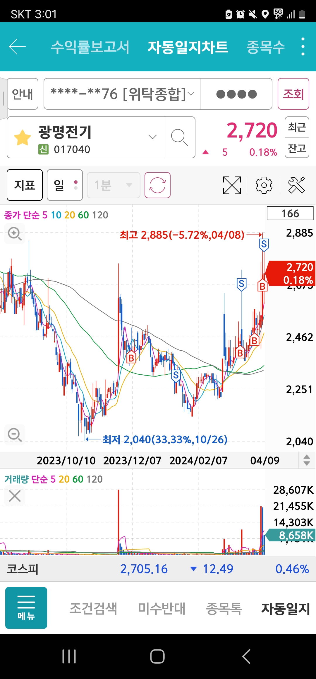 첫번째 장대양봉 이후에 매수했지만 몇달 간 지지부진하다가 손절. 그러나 2번째 매집봉, 갭상승 장대음봉 만든 이후 상승 중.